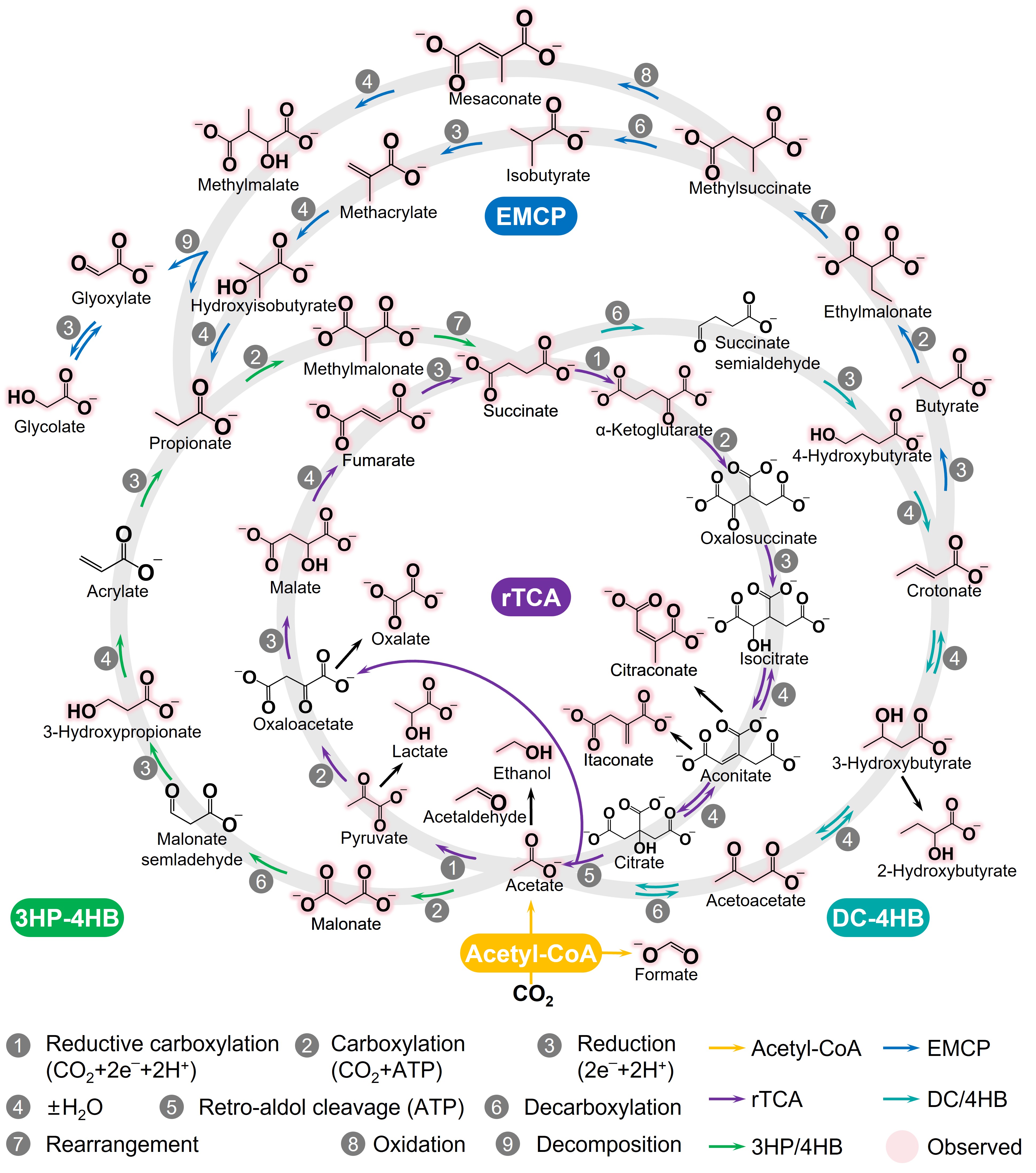 本研究首先展示了在1T'-MoS2催化下,以H2为还原剂构建的自组织非酶促代谢网络。该网络成功模拟了生物体内五大关键碳固定途径(acetyl-CoA, rTCA, 3HP-4HB, DC-4HB, EMCP),并通过乙酸、琥珀酸等关键代谢中间体实现各子系统的动态耦合,展现出类似生命系统的结构与功能特征。