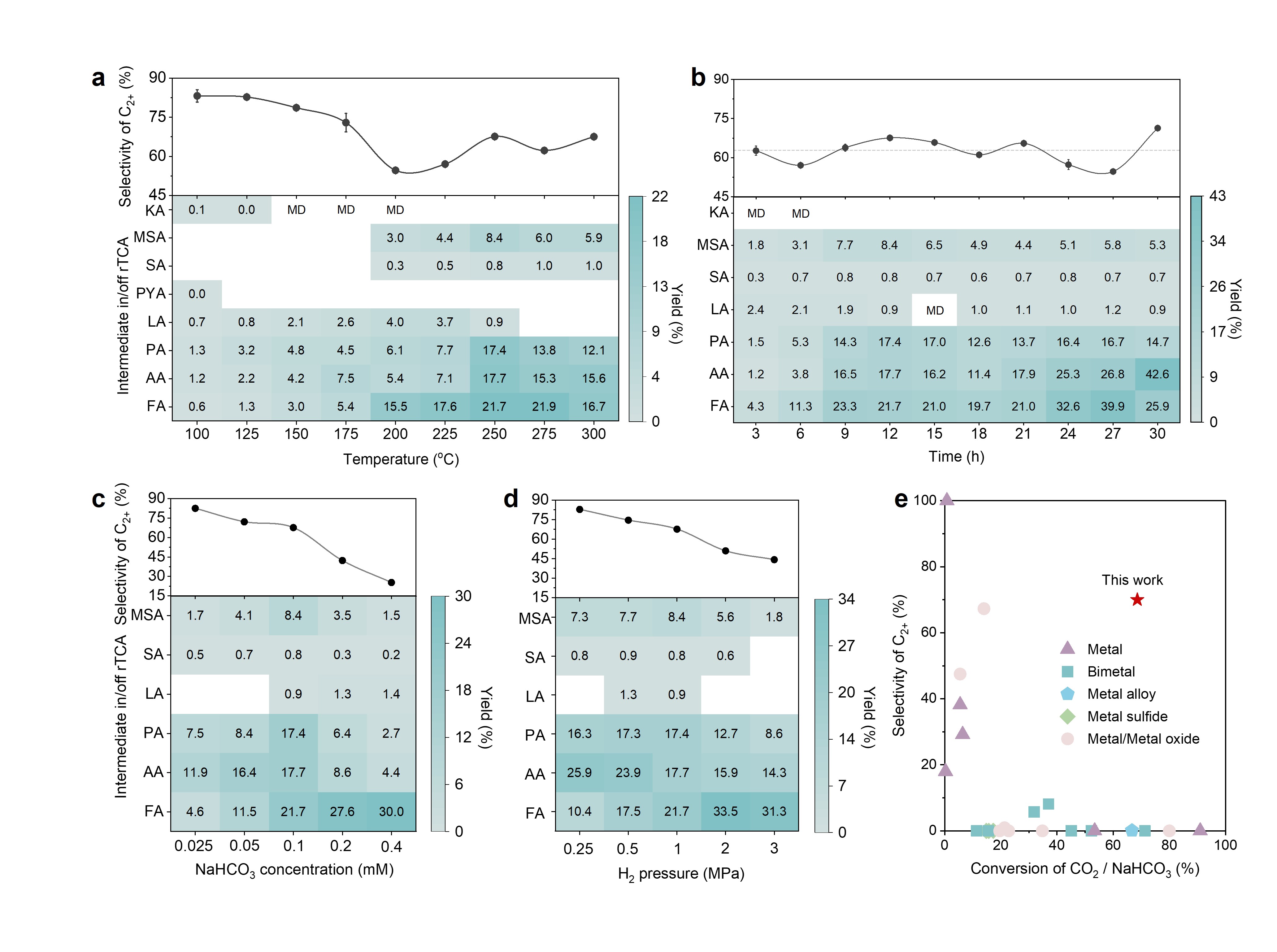 研究系统评估了温度、反应时间、反应物浓度及压力等关键参数对产物分布和C2+羧酸选择性的影响。结果表明,高温条件更有利于C−C键的形成与耦合反应,显著促进复杂有机分子的生成。实验观察到,C2+羧酸的选择性随反应时间呈现周期性振荡的动态分布特征,体现出该非酶促网络具备类似天然自组织系统的动力学行为。此外,该催化体系在CO2转化率和产物选择性方面均显著优于此前报道的大多数金属基催化剂,展现出优异的催化性能与应用潜力。