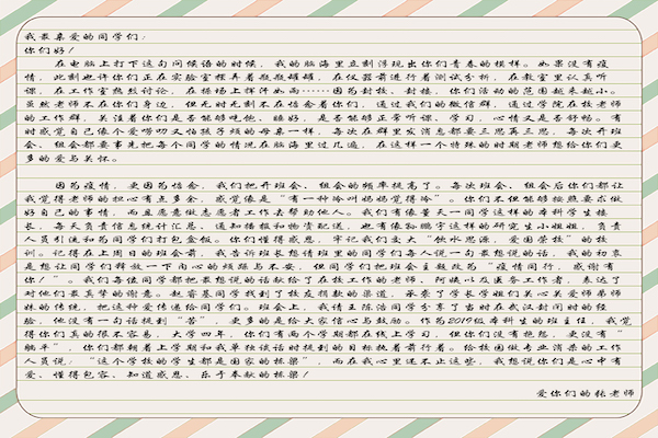 张波老师不但是学生心目中的“专业领航人”,更是校园生活的“绘画家”。她曾多次组织午餐会等团建活动,增强班级凝聚力;疫情期间,她坚持每周召开班会,关心关爱班级学生,并提供耐心有效的心理疏导。由她撰写的《盼望疫情消散,期待早日相见》给学生的一封信,被“学习强国”等平台转载报道,成为师生同心抗疫、守望相助的暖心篇章。