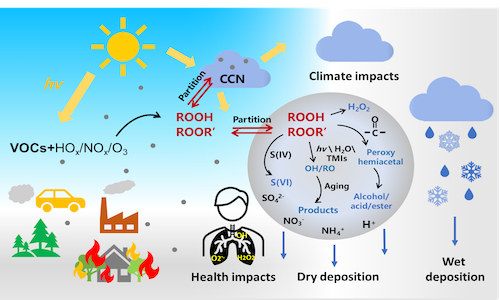 有机过氧化物(含有一个或多个过氧键-O-O-的有机物)是大气中有机污染物氧化降解的重要中间体,其化学性质活泼,且相当一部分具有低挥发性或高水溶性,容易经过气-粒分配进入颗粒物或云雾液滴中,对大气气溶胶的形成、增长和演变具有重要贡献。此外,有机过氧化物是气溶胶中活性氧物种(ROS)的重要来源,对气溶胶的氧化潜势和健康效应具有重要影响。因此,研究有机过氧化物的大气化学行为对于准确理解气溶胶的生消演变及其环境和健康效应具有重要意义。