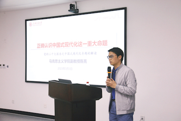 3月3日下午,雷竞技raybat竞猜举办中国式现代化专题党课,特邀马克思主义学院陈亮副教授作题为“正确认识中国式现代化这一重大命题—党的二十大报告之中国式现代化专题的解读”专题讲座。学院党委中心组全体成员、师生党支部书记、支部委员、团学骨干等参加学习,党委书记胡薇薇主持会议。