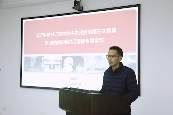 学院党委委员楼紫阳领学习近平总书记在中共中央政治局第三次集体学习时的重要讲话精神。当前新一轮科技革命和产业变革突飞猛进,正在重构全球创新版图、重塑全球经济结构,学科交叉融合不断发展,国际科技竞争向基础前沿前移。习近平总书记在主持学习时强调,加强基础研究,是实现高水平科技自立自强的迫切要求,是建设世界科技强国的必由之路。他指出,作为一名高校科研工作者,必须厘清基础研究内涵,立足环境学科问题导向,平衡基础学科与其他学科关系,加强基础设施投入创新,将走出去和引进来相结合,培育吸纳高水平人才,营造风清气正的科研环境,探索生态治理多样化路径。