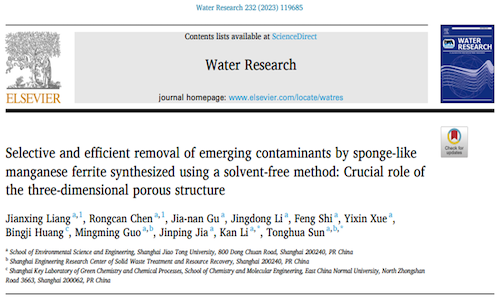 近日,雷竞技raybat竞猜贾金平团队在环境领域著名学术期刊Water Research上发表了题为“Selective and efficient removal of emerging contaminants by sponge-like manganese ferrite synthesized using a solvent-free method: Crucial role of the three-dimensional porous structure”的研究论文。