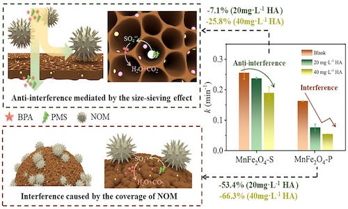 本文采用无溶剂熔融法制备了具有三维分层多孔结构的海绵状磁性锰基铁氧体(MnFe2O4-S)。与MnFe2O4-P的颗粒状结构相比,其结构上的变化有望提高活化剂降解活性,克服NOM干扰。采用MnFe2O4-S活化过一硫酸盐(PMS)来降解多种新型污染物,并将其与MnFe2O4-P在有无腐殖酸(HA)的条件下降解双酚A的能力进行比较。MnFe2O4-S的降解效率是MnFe2O4-P1.6倍。此外,20 mg·L-1 HAMnFe2O4-S降解活性的抑制作用仅为7.1%,远低于MnFe2O4-P53.4%MnFe2O4-S的抗干扰特性和高效的降解效果在多种水基质中也得到保持。特别在湖水基质中,MnFe2O4-P的降解活性被抑制了35.6%,而MnFe2O4-S的降解活性几乎没有受到抑制。这一成果为绿色合成具有抗环境干扰性能的高活性多孔尖晶石铁氧体提供了另一种途径。