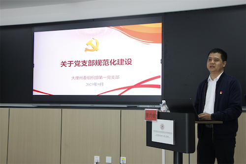 欢迎仪式结束后,全体参会领导、师生进行了交流座谈,深入探讨了专业学位研究生培养支撑和科研成果转化等问题,为研究生在大理的工作、学习和生活答疑解惑。同时开展联培基地第一课活动,特邀大理州委组织部第一党支部书记曹灼敏为同学们讲授了一堂生动的党课,引导和鼓励大家传承红色精神,夯实理想、笃定前行。研究院孙天阳、张琳老师介绍了联培基地相关管理制度和实验室相关规定,以更好更快开展相关科研工作。