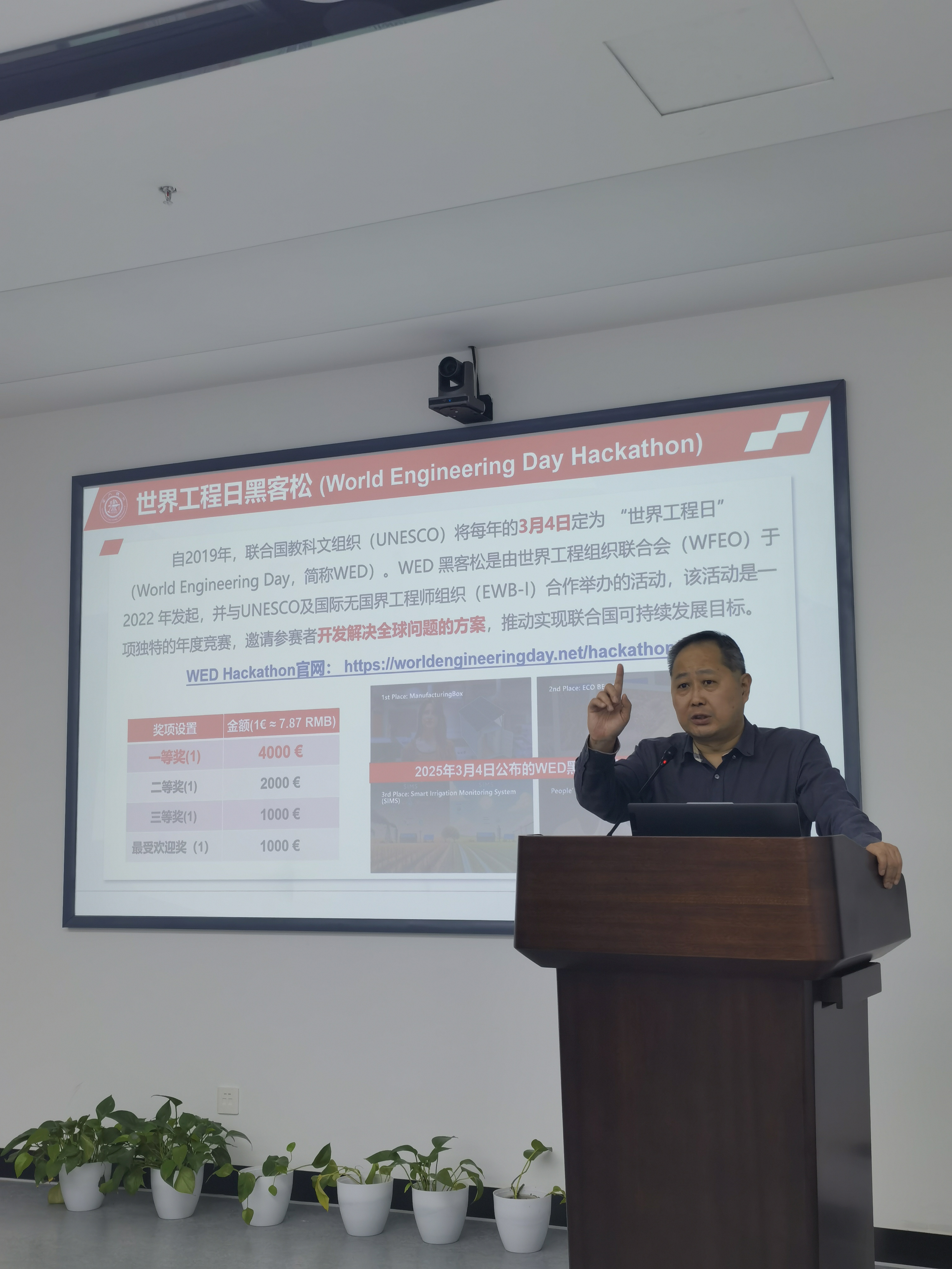 首先,耿涌向同学们介绍了世界工程日黑客松竞赛项目。此竞赛紧扣联合国可持续发展目标,如“消除贫困”和“塑料污染的创新解决方案”,为环境学生提供了将专业知识应用于实际问题解决的机会。同时,竞赛鼓励跨学科合作,环境学生可以与其他学科的学生携手,开发出更具综合性和创新性的解决方案。此外,竞赛的全球化交流平台,与国际组织、企业和学术界的评委及观众互动也能够让环境学生扩展视野。
