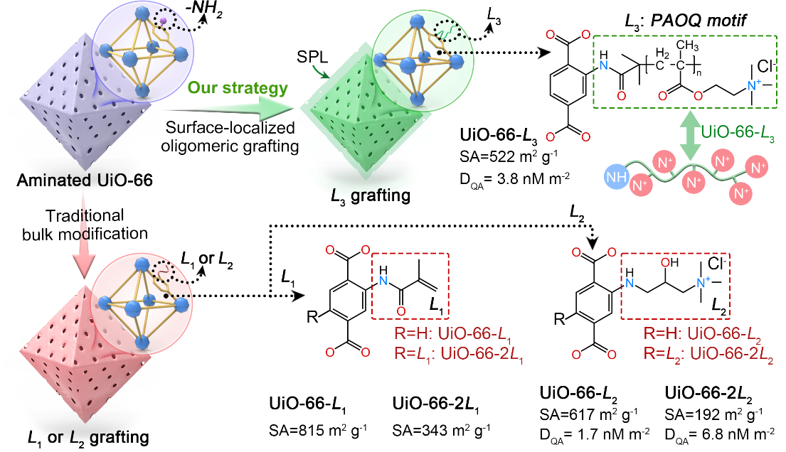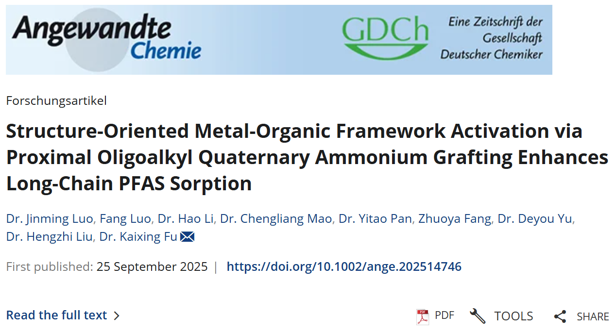 近日,雷竞技raybat竞猜罗金明副研究员在《德国应用化学》(Angewandte Chemie)上发表了题为“Structure-Oriented Metal-Organic Framework Activation via Proximal Oligoalkyl Quaternary Ammonium Grafting Enhances Long-Chain PFAS Sorption”的研究成果。该研究成果突破传统MOF修饰局限,提出了一种表面局域化寡聚枝接策略,在UiO-66-NH₂表面精准构筑了邻近排列的寡聚烷基季铵盐(PAOQ)功能基元。该设计巧妙规避了MOF内部微孔的空间限制与传质壁垒,实现了功能基团负载量2.2倍的提升,并通过季铵盐与柔性烷基链的精确空间协同,实现了对长链PFAS的双模式高效捕获。