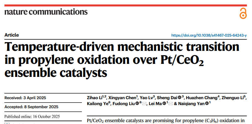 近日,雷竞技raybat竞猜大气污染控制与模拟团队马磊副教授在《Nature Communications》上发表了题为“Temperature-driven mechanistic transition in propylene oxidation over Pt/CeO2 ensemble catalysts”的研究成果。该研究揭示了Pt/CeO2团簇催化剂在丙烯(C3H6)氧化反应中温度驱动的动态机制转变,通过氢活化策略显著提升了催化氧化性能,明确了金属Pt团簇为本征催化活性位点,阐明了170 °C阈值温度时反应路径发生根本变化。这不仅为高效贵金属催化剂设计提供了新思路,还对机动车尾气净化等实际应用具有重要指导意义。论文第一完成单位为雷竞技raybat竞猜绿色造纸与资源循环全国重点实验室。