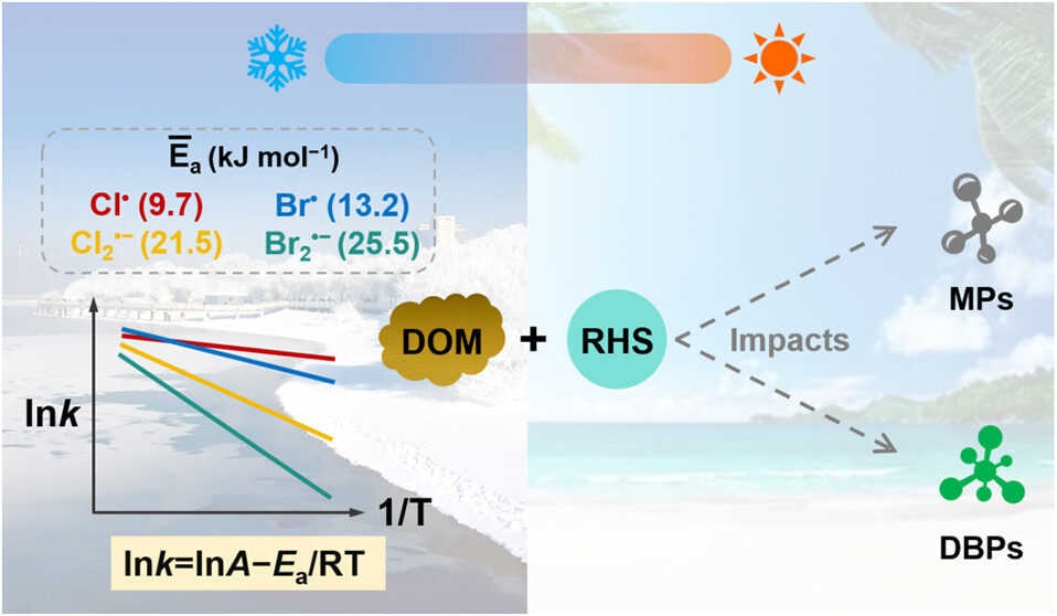在天然水体和市政水处理系统中,由于卤素离子的广泛存在,卤素自由基(RHS)可通过多种途径生成,并对污染物的降解与有害卤代副产物的生成起重要作用。现有RHS的研究主要集中在室温条件下,然而不同季节、不同纬度地区水温差异显著,势必会影响RHS的生成及转化过程。DOM作为RHS的主要清除剂,极大影响RHS在水体中的浓度和归趋,然而目前仍缺乏DOM与RHS反应的温度依赖性研究。