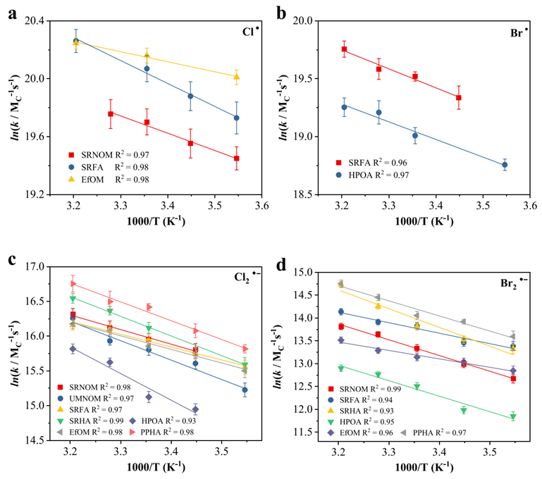 图1. DOM与4种卤素自由基反应速率常数的温度依赖性。