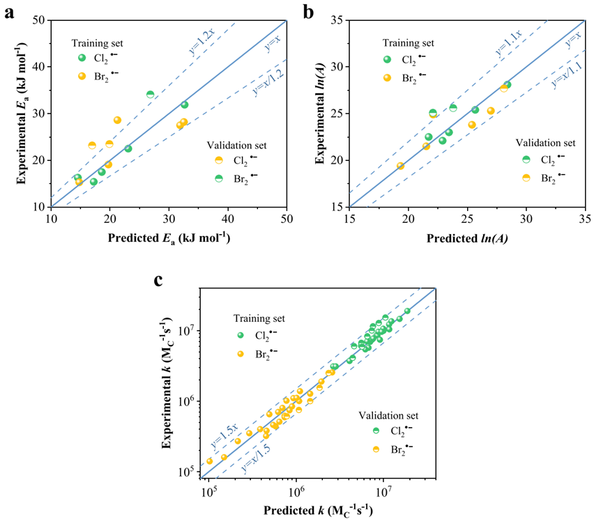 图2. 实验测定值与预测值之间的相关性:(a)活化能(Ea),(b)指前因子(ln(A)),(c)不同温度下卤素自由基与DOM的反应速率常数(k)。