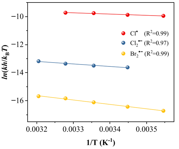 图3. SRNOM与Cl·, Cl2·和Br2·−反应的Eyring图。斜率和截距分别代表-ΔH/RΔS/R