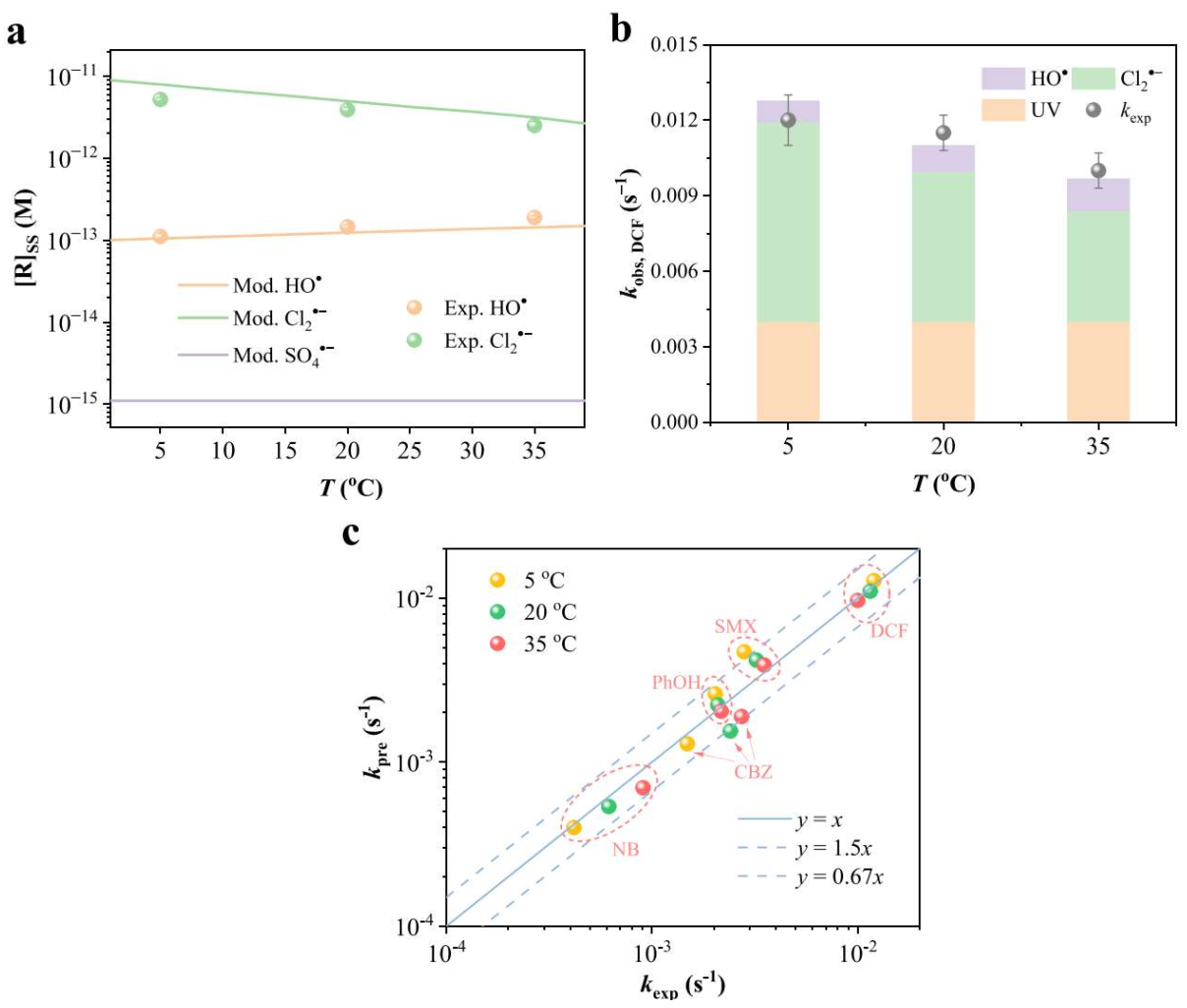 图4.(a)UV/PDS+Cl体系中的自由基稳态浓度;(b)各类自由基及紫外光对双氯芬酸(DCF)降解的贡献。柱状图表示根据模型计算的自由基浓度所得的DCF降解速率,点表示实验测得的速率;(c)不同温度下微污染物的实验测得一级降解速率常数(kexp)与预测值(kpre)的相关关系。