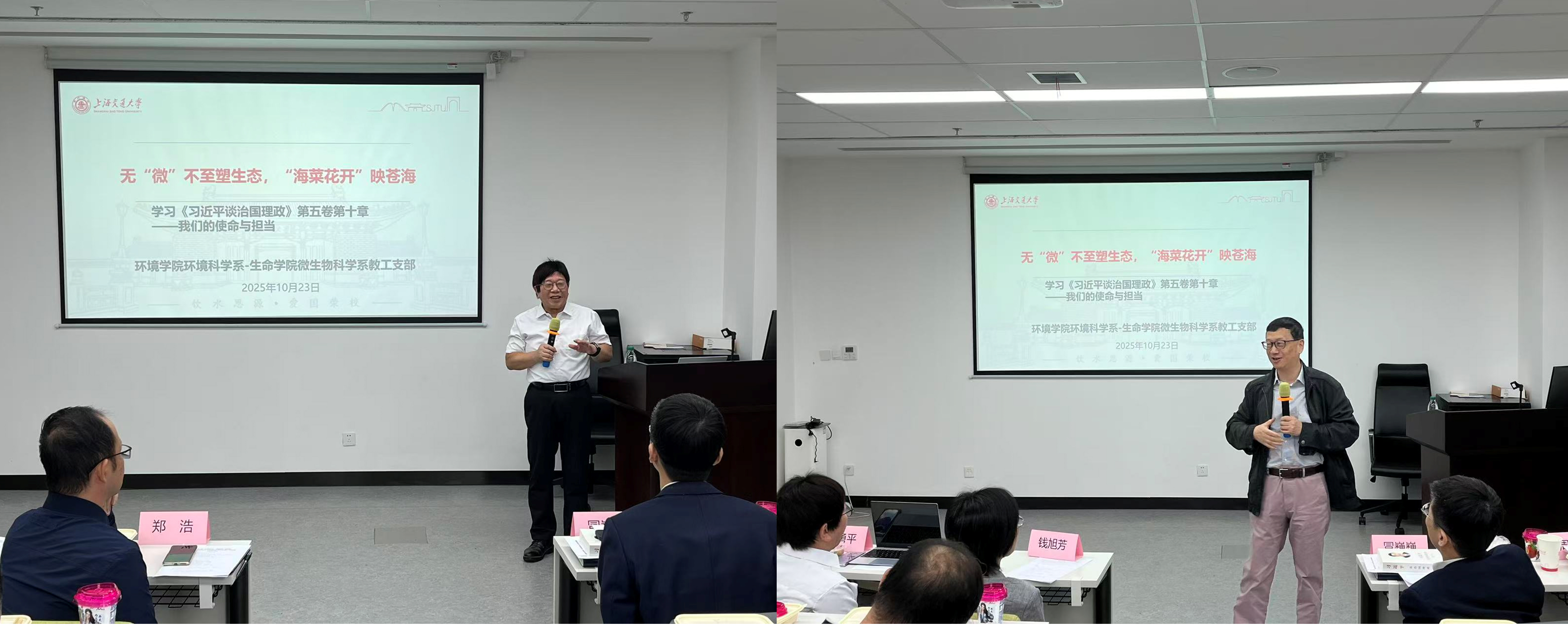赵砚彬系统介绍了环境学院在污染治理、资源化利用、环境健康等方向的学科布局,以及近年来取得的标志性成果,展现了服务国家战略的科研实力。微生物科学系教工党支部徐俊重点分享了在环境微生物、生物催化等前沿方向的技术突破,为双方后续科研合作锚定了精准对接点。双方通过重温《习近平生态文明思想学习纲要》等使大家深刻认识到,推动“人与自然和谐共生”的生态文明建设,是对中华优秀传统文化的继承与发展。与会党员一致表示,要将这一思想伟力转化为攻坚克难的业务本领,以务实作风为建设美丽中国贡献力量。双方还就聚焦具体科研方向展开深入研讨。