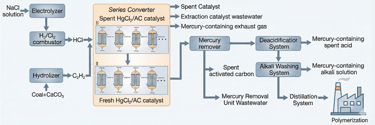本研究开发了一种能在高C2H2和HCl浓度下实现Hg0和Hg2+同步实时检测方法,系统阐明乙炔氢氯化反应中汞流失的多元机制,重点解决反应热点导致的HgCl2分解、C2H2与Hg2+的π-d轨道相互作用以及氯过载诱导的脱附等核心科学问题,量化关键操作参数对汞排放的贡献,并建立汞排放预测框架,为电石法PVC合成过程中的汞污染控制提供可操作的减排策略。