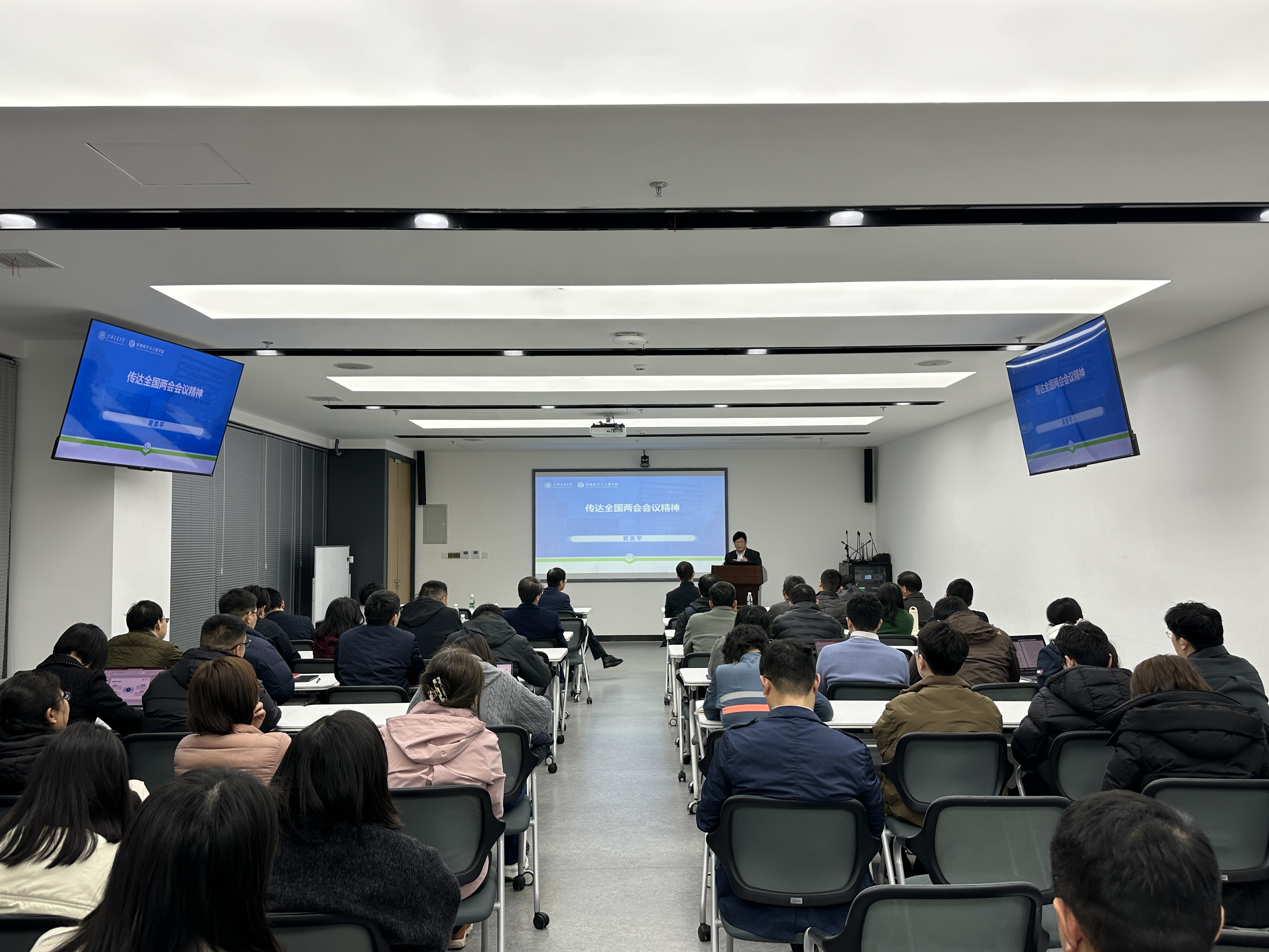 3月23日下午,环境学院2026年春夏学期第一次全院教职工大会在绿色环境楼231会议室举行。会上,全国人大代表、学院特聘教授黄勇平老师受邀传达全国两会会议精神,为全院教职工带来了一堂生动的两会精神学习课。