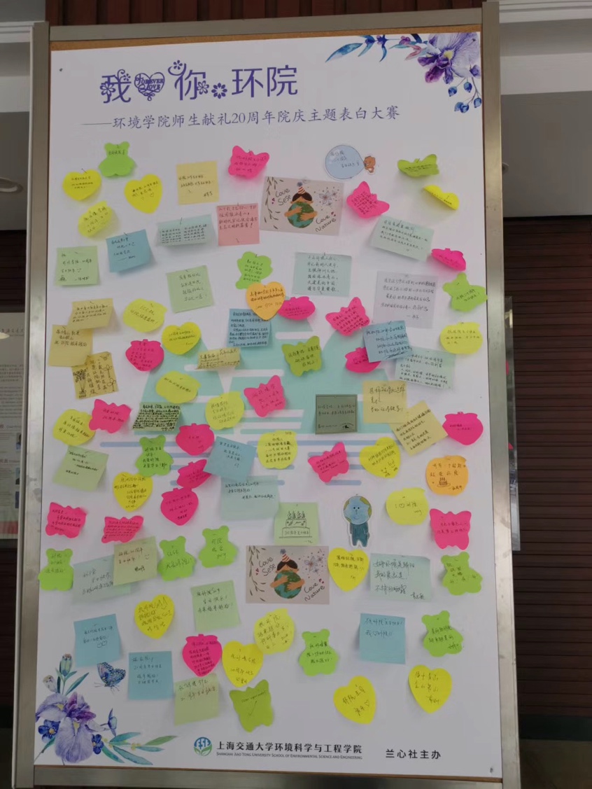 此次大赛主要分线下、线上两部分活动。线下活动于11月7日中午在环境学院一楼大厅举行。活动现场气氛高涨,吸引百余名师生参与,其中还包括海外教师及国际学生。师生们纷纷留下对环境学院最真挚的祝福,精心布置的表白墙上贴满了五颜六色的便利贴。兰心社还特意为参与活动的师生们准备了绿植,愿师生们一直保有活力,为建设美丽中国贡献自己的力量。贴满大家祝福语的表白墙成为了学院温馨亮丽的一道风景线!