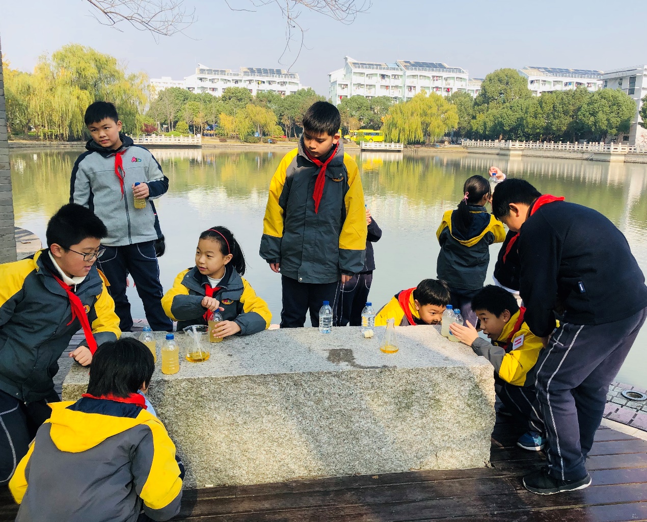 在校园中区,同学们围绕景观水体的水质调查体验了环保小卫士的工作。在大学生志愿者们的带领下,师生们对捭阖塘(荷花塘)、涵泽湖、交大二号河三个景观水体的水质进行了仔细观察和水样采集,并在王红艳、陶燕妍老师及志愿者们的帮助下对水样的浊度和溶解氧进行了现场测定和水质分析。