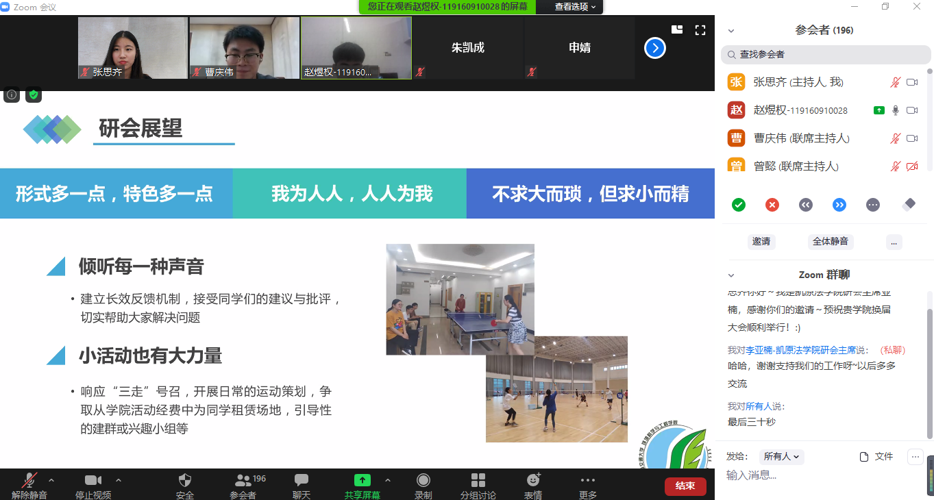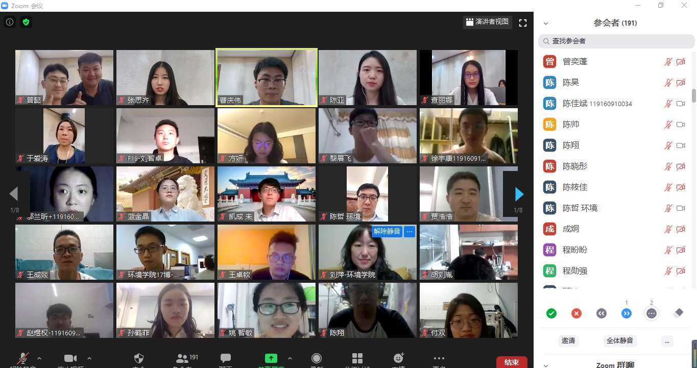 雷竞技raybat竞猜校研究生会执行主席林云鹏同学为本次大会致辞,他肯定了环境学院从广大师生群体的切身利益和需求出发举办的一系列学风学术和文体娱乐活动,并线上云合影留念。