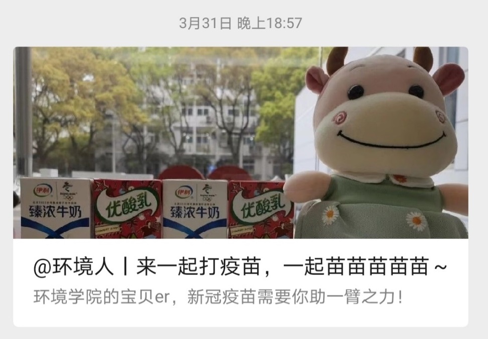 抓住“我们一起打疫苗,一起苗苗苗苗苗”标语的时事热点,推送了环境学院疫苗接种提示与环院接种大礼包~