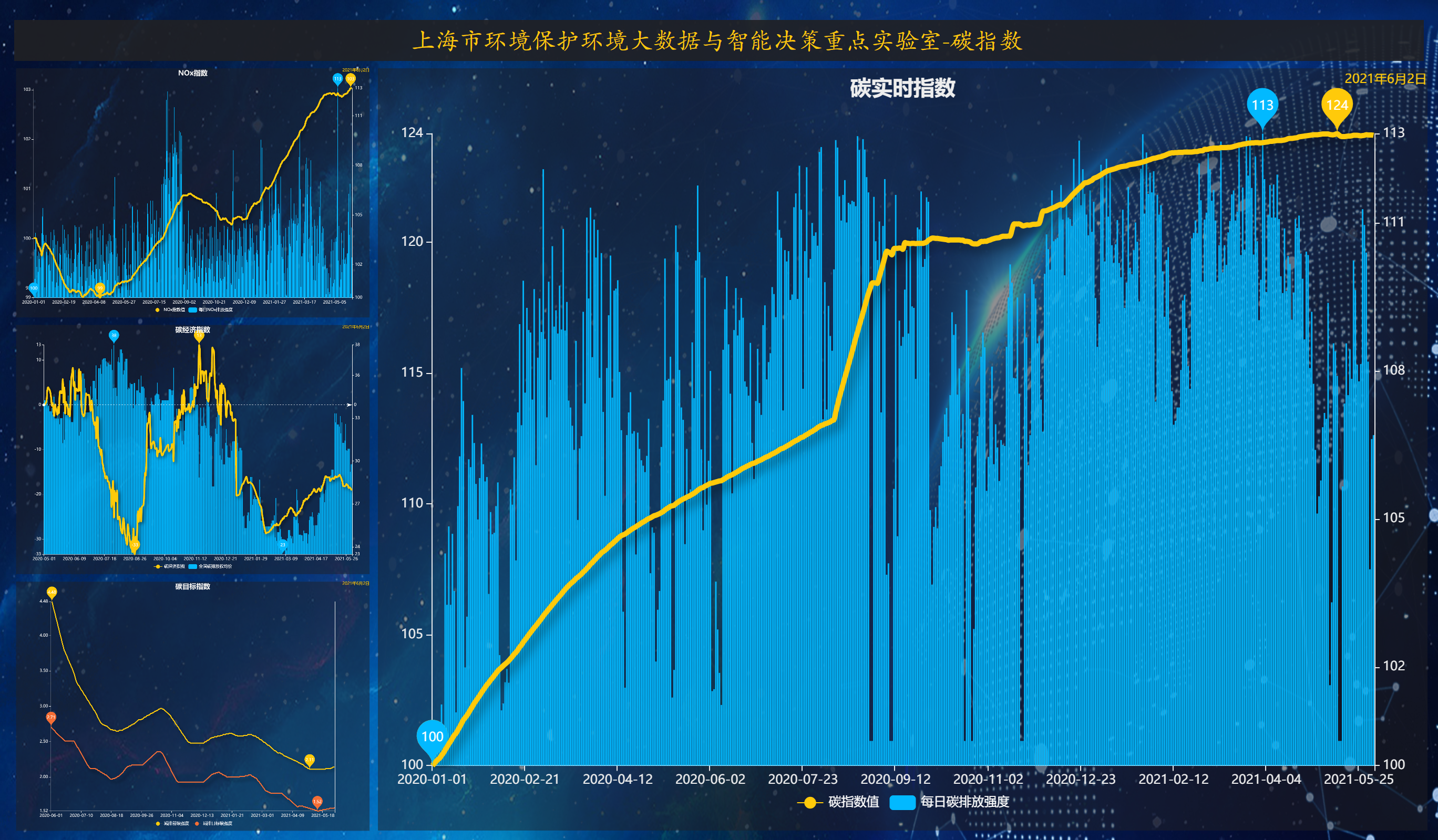 在蓝天保卫战与应对气候变化方面,降碳与减污之间可以产生很好的协同效应。雷竞技raybat竞猜作为依托单位,联合上海市环境监测中心、上海市环境保护信息中心共同建设了上海市环境保护环境大数据与智能决策重点实验室,实验室与瑞格智研联合研究团队应用大数据和人工智能技术,结合行业、企业的生产经营和污染物排放状况,创建了实时动态的碳污协同减排指数体系,分析得出了碳系列指数——碳排放指数、碳目标指数、碳经济指数。