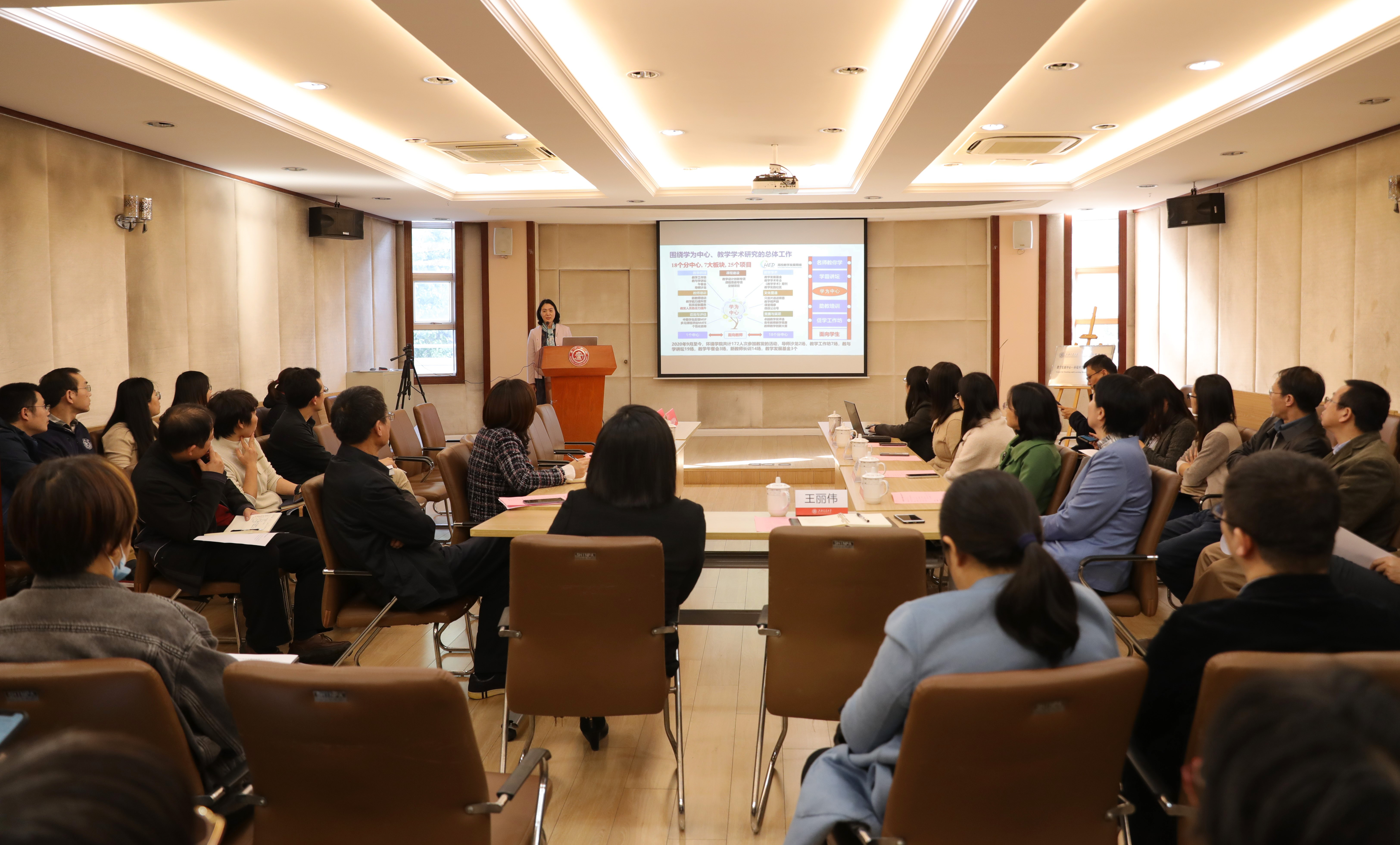 成立仪式后,分中心开展了第一期教师教学发展活动。王丽伟介绍教学发展中心整体工作。她首先强调了教学发展中心的工作目标,坚持推广“学为中心”理念,推广教学学术研究,引导和带动教师潜心教学、创新教育教学模式;其次展示了教学发展中心围绕“学为中心、教学学术研究”展开的总体工作,并详细介绍了中心计划推进的重点业务。王丽伟表示,教学发展中心致力于引导每一位教师热爱教学、走在教师教学发展的最优路径上,需要一线教师与教发人员携手同行,教发应该是一群热爱教学的教师与教学发展人员组成的共同体。