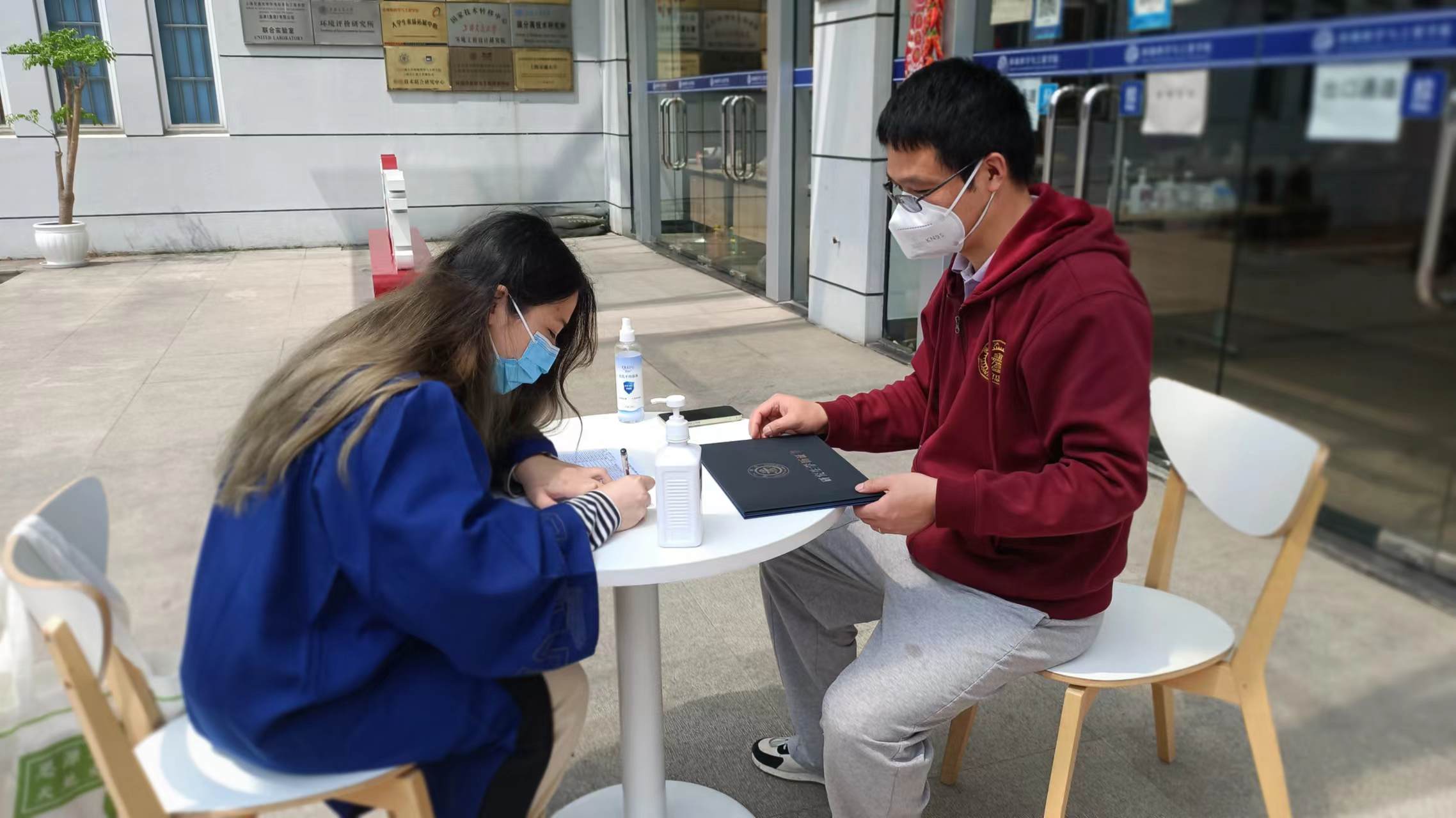 因受疫情影响,环境学院毕业典礼无法如期举行。为弥补这一遗憾,坚守抗疫一线的老师们通过精心安排,特意为2022届首位领取双证的硕士毕业生在环境楼外举行了一场暖心的欢送仪式。