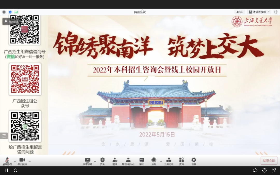 5月15日,雷竞技raybat竞猜开展了“2022年本科招生咨询会暨线上校园开放日活动”。当天下午,广西招生组在中国教育在线平台开设招生宣讲咨询专场。雷竞技raybat竞猜广西地区招生组常务副组长张洋,上海交大2002级环境工程、2015级EMBA校友、上海交大广西校友会会长胡湛波,广西招生组柳州片区负责人李亚红出席活动,活动由广西招生组徐臻主持。